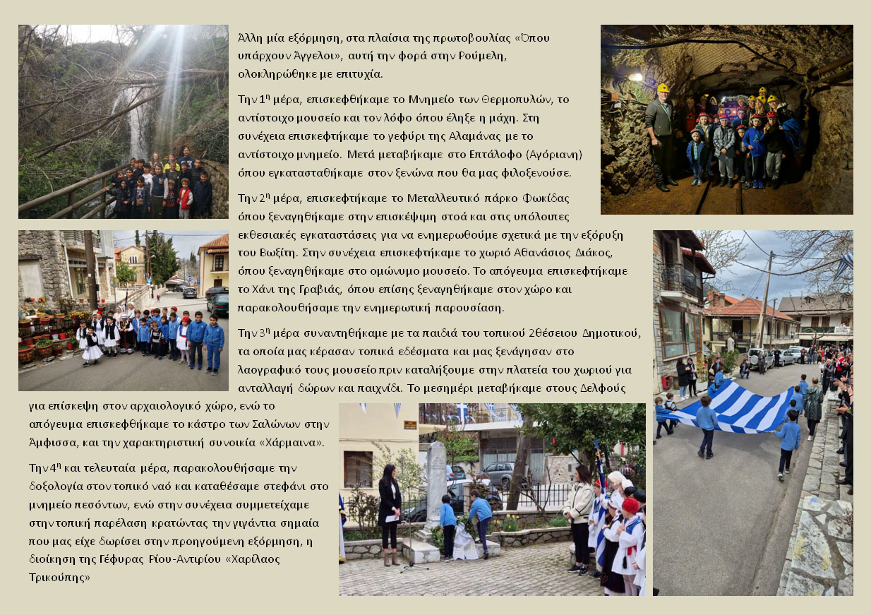 Την 2η μέρα, επισκεφτήκαμε το Μεταλλευτικό πάρκο Φωκίδας όπου ξεναγηθήκαμε στην επισκέψιμη στοά και στις υπόλοιπες εκθεσιακές εγκαταστάσεις για να ενημερωθούμε σχετικά με την εξόρυξη του Βωξίτη. Στην συνέχεια επισκεφτήκαμε το χωριό Αθανάσιος Διάκος, όπου ξεναγηθήκαμε στο ομώνυμο μουσείο. Το απόγευμα επισκεφτήκαμε το Χάνι της Γραβιάς, όπου επίσης ξεναγηθήκαμε στον χώρο και παρακολουθήσαμε την ενημερωτική παρουσίαση.